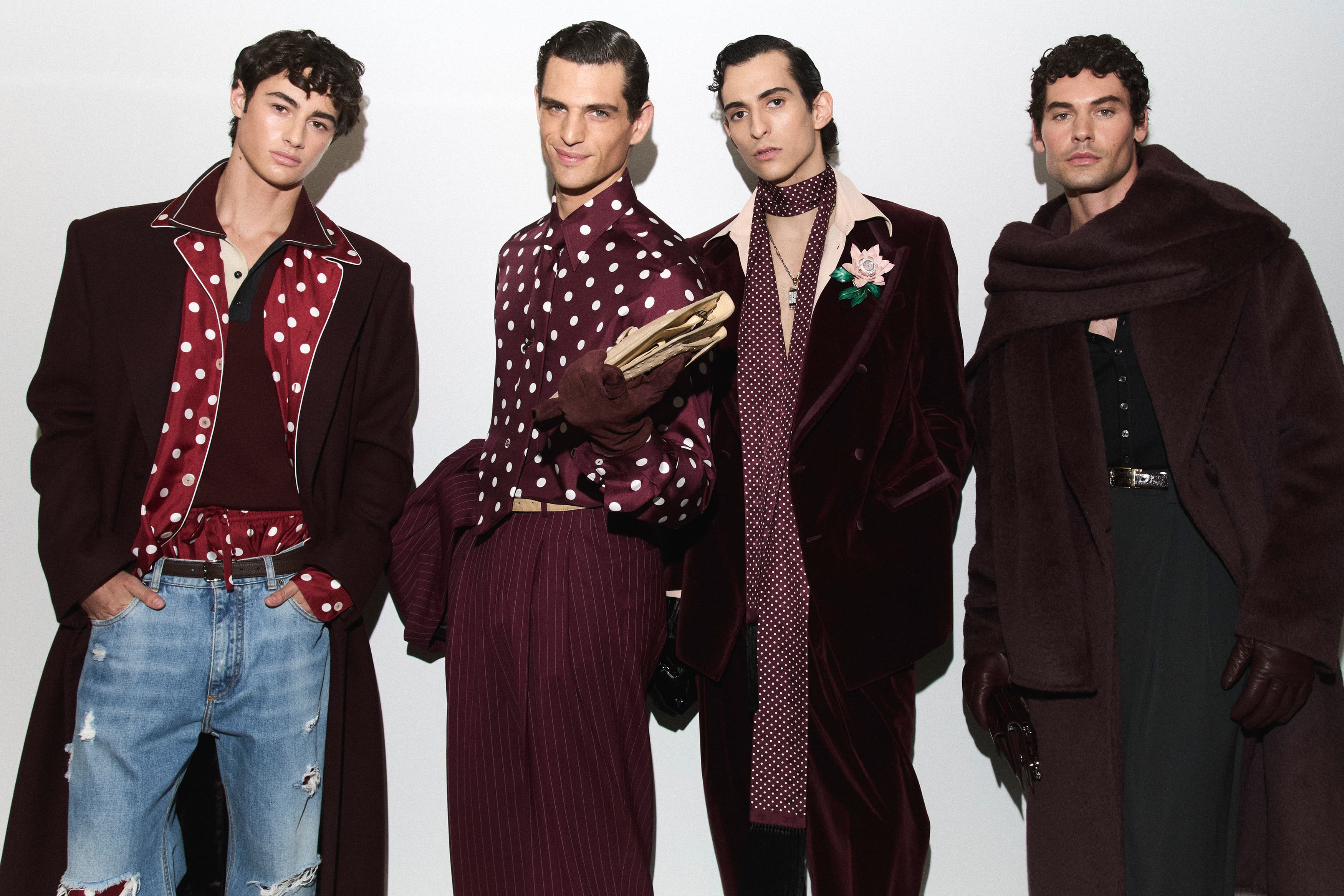 标志性的 Nero Sicilia 开启 Dolce&Gabbana 想象绮境的大门,这方绮境由白衬衫、平顶帽、黑色针织、天鹅绒西装、细条纹与波点纹样等元素构成,渲染出黑、白、酒红与多重色调,共同勾勒出真挚精雅格调的多样表达。这种诠释始终展露着其源于过往、不竭灵感以及与当今的交流对话的标志性人物型格。
