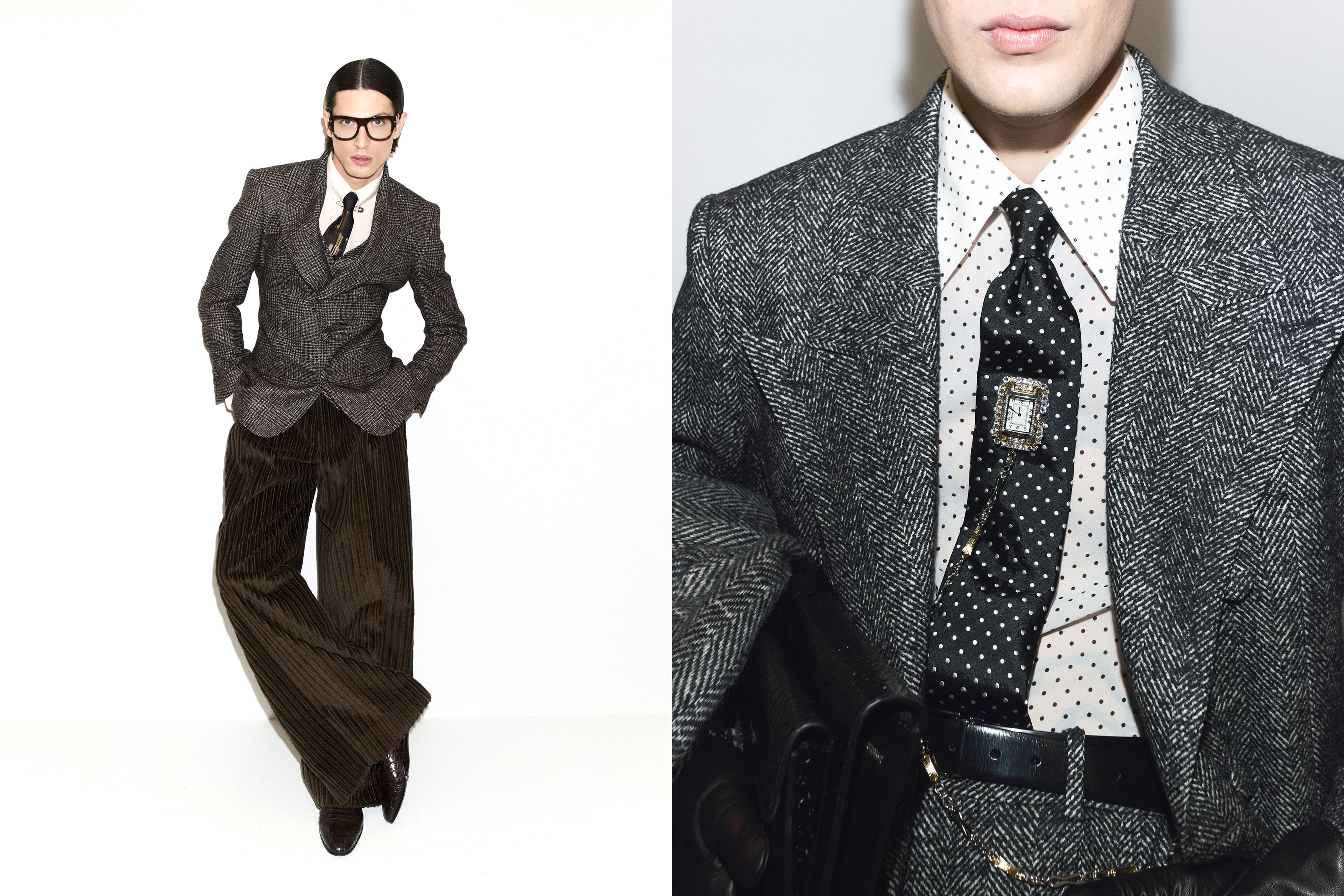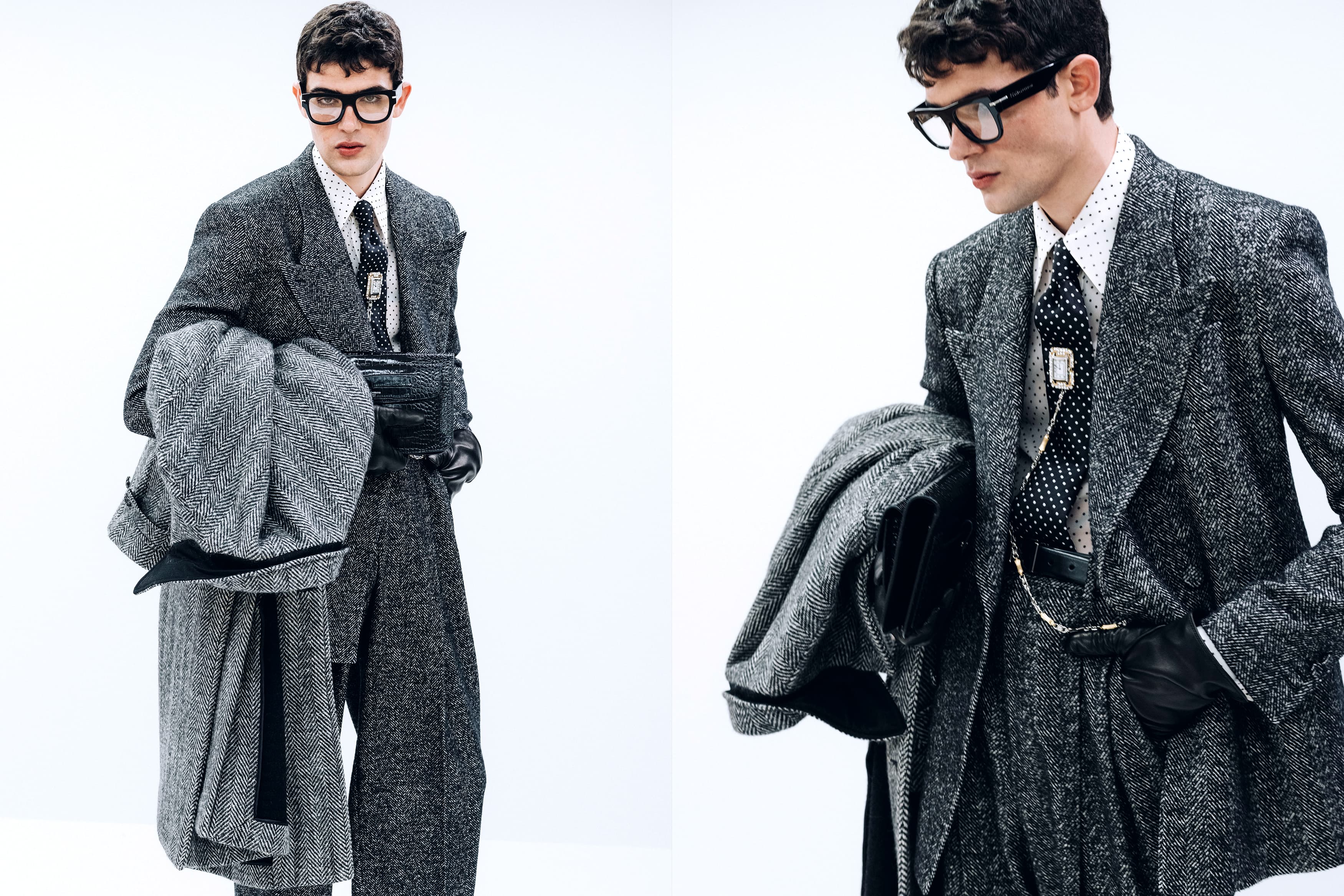肩部设计勾勒个性;衣型结构揭启意图;面料与肌理则传叙着记忆与存在。从深邃天鹅绒到致密羊毛,从哑光丝绸到当代织锦,各款材质映现出不同的日常面貌。匠心定制的印记贯穿多套秀场造型中,随着各式搭配与象征的男士形象诠释出不同细微差别与别样风格意蕴。