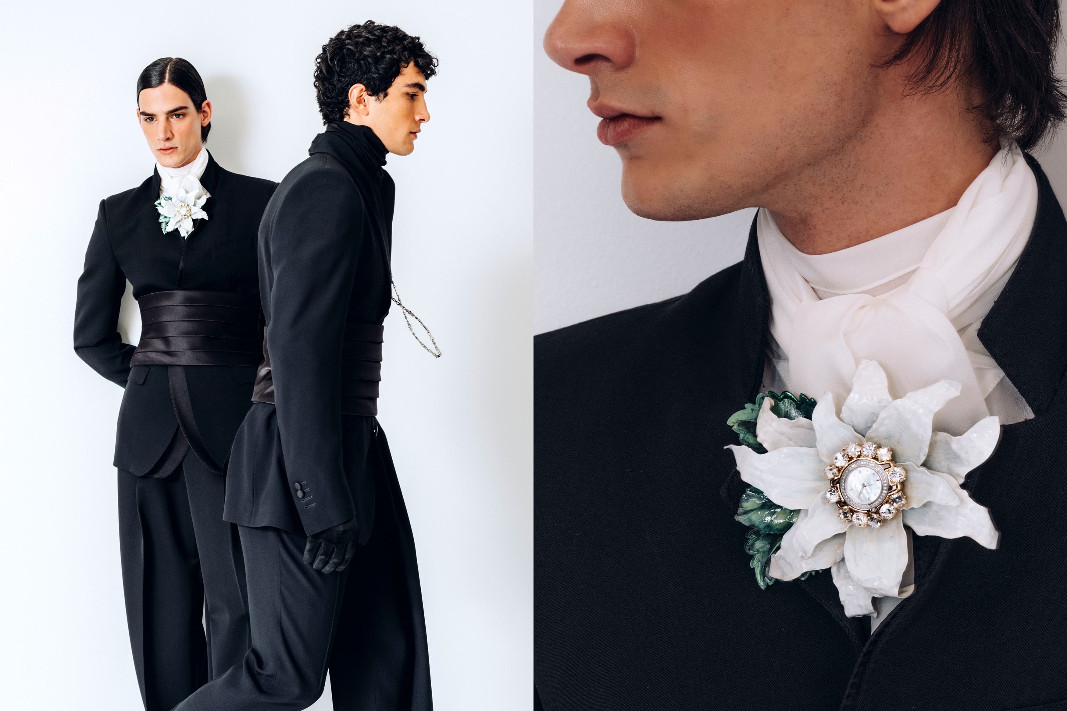 精裁技艺是男士红毯造型的表达语言,量身定制的西装套装与为特殊场合而生的正装为其精髓。细致、上乘的黑白色面料交相辉映,灿然焕现自具风骨、不循既制的独特型格。