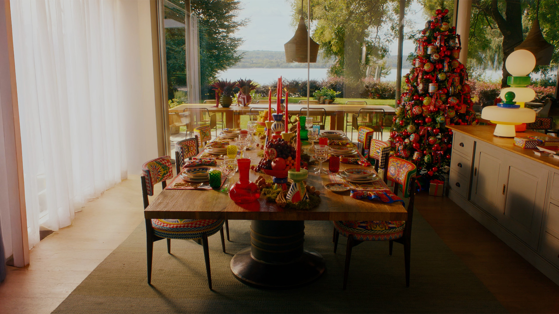 Dolce&Gabbana Casa 餐桌布置的创作灵感源自西西里马拉车 (Carretto Siciliano) 图案,倾情演绎温馨团聚的绝美艺术。